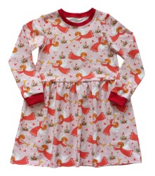 Šatičky s dlouhým rukávem ušité z bavlněného úpletu s elastanem s vánočním vzorem. Přestřižené v pase, sukýnka nabíraná. Průkrčník a rukávy lemované nápletem červené barvy.