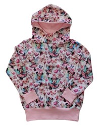 Mikina s kapucí ušitá z teplákoviny s krásným jemným vzorem, vnitřek kapuce světle růžová tenčí teplákovina. Všitý rukáv. Rukávy a spodní okraj lemovány pružným nápletem světle růžové barvy.