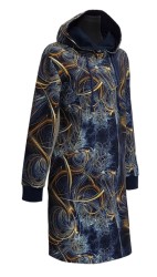 Mikinošaty ušité z příjemné teplákoviny s motivem zlatých ornamentů na tmavě modré. Do kombinace jsem zvolila tmavě modrou - vnitřek kapuce (úplet), náplety na rukávech a prošití spodního okraje. Boční vsadky s kapsami ze stejné látky.