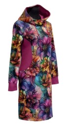 Mikinošaty ušité z příjemné teplákoviny se vzorem velkých květů. Do kombinace jsem zvolila ostružinovou - boční díly s kapsami (teplákovina), vnitřek kapuce (úplet), náplety na rukávech a prošití spodního okraje.